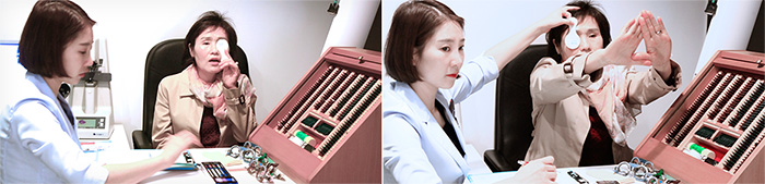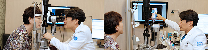 동공을 일시적으로 확장시키는 산동제를 넣은 후 확대된 동공 속 수정체 상태를 세극등(안과진료용 현미경의 일종)으로 안과전문의가 검사. 수정체 상태 및 백내장이 어느 부위에 어느정도 진행되고 있는지 살필 수 있습니다.