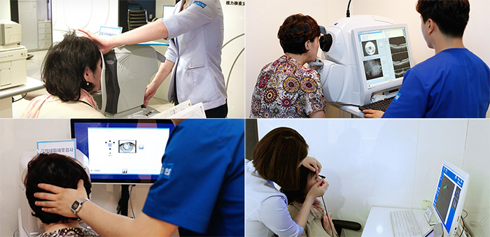 안과용 CT기를 이용해 녹내장이나 망막질환, 시신경 이상 유무 검사, 첨단기기를 이용한 안압검사, 빛에 대한 반응 및 시신경의 이상 유무를 파악해 녹내장 및 망막 이상을 확인하는 정밀시야검사, 망막 변성 및 손상 유무를 파악하는 안저검사