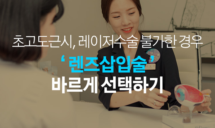 - 초고도근시, 고도원시, 각막두께가 얇은 경우, 난시가 심한 분, 안구건조증이 심한 분, 야간 동공 크기가 매우 큰 분 처럼 레이저로 각막을 절삭하는 라식이나 라섹이 부적합한 분에게 적합한 시력교정술이 렌즈삽입술입니다.