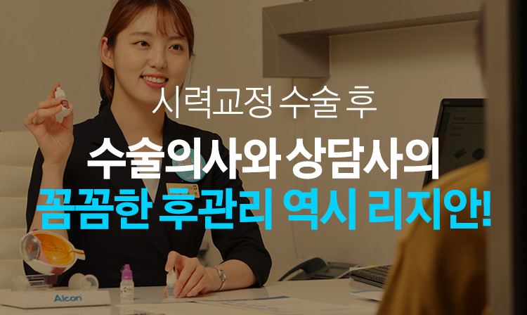 시력교정 수술 상담 경험이 풍부한 전담직원이 고객 한 분 한 분마다 수술 후 주의사항, 내원 스케줄, 약 복용법, 회복기 안내 등을 원내에서뿐 아니라 유튜브 영상 문자 전송 서비스로도 제공합니다.