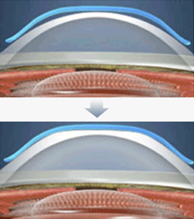 렌즈를 착용하는 동안 드림렌즈의 특수한 디자인에 의해 각막 중심부가 눌리면서 마치 각막절삭의 라식수술 후 목표시력교정이 된 것과 같은 효과를 일시적으로(렌즈 없이 1~2일 정도) 얻을 수 있습니다.