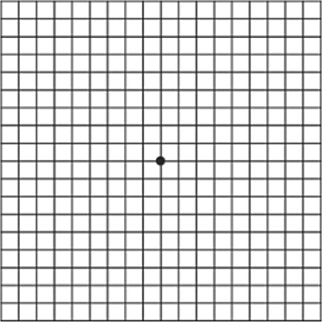 밝은 곳에서 평소 착용하던 안경이나 콘택트렌즈를 쓰고 한쪽 눈을 가린 채 30cm 정도 떨어진 거리에서 격자 가운데 점을 보았을 때 선이 휘어 보이거나 점이 잘 보이지 않거나 선의 일부가 끊겨 보이거나 뿌옇게 보이거나 찌그러져 보인다면 황반변성을 의심할 수 있습니다.